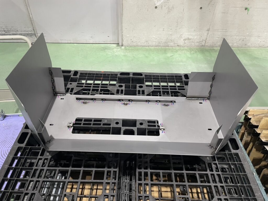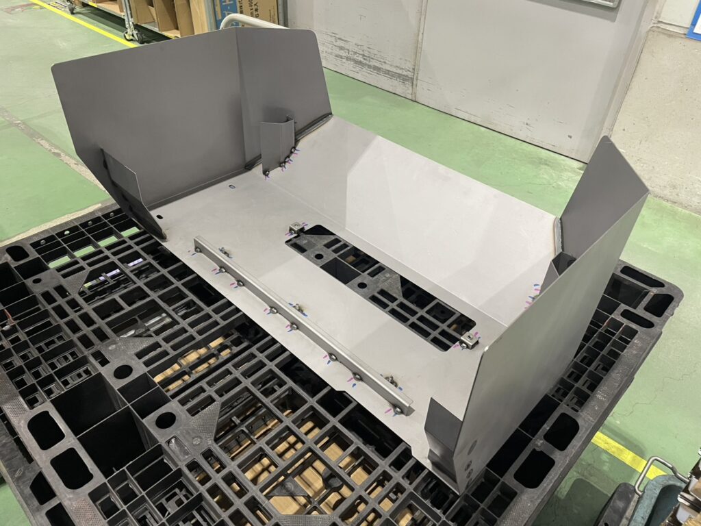本製品は、SPHC(熱間圧延軟鋼板)を使用した、大型エンジンフォークリフト向けのラジエーターカバーです。大小さまざまな板金部品を組み合わせた複雑構造となっており、強度が求められる製品となります。