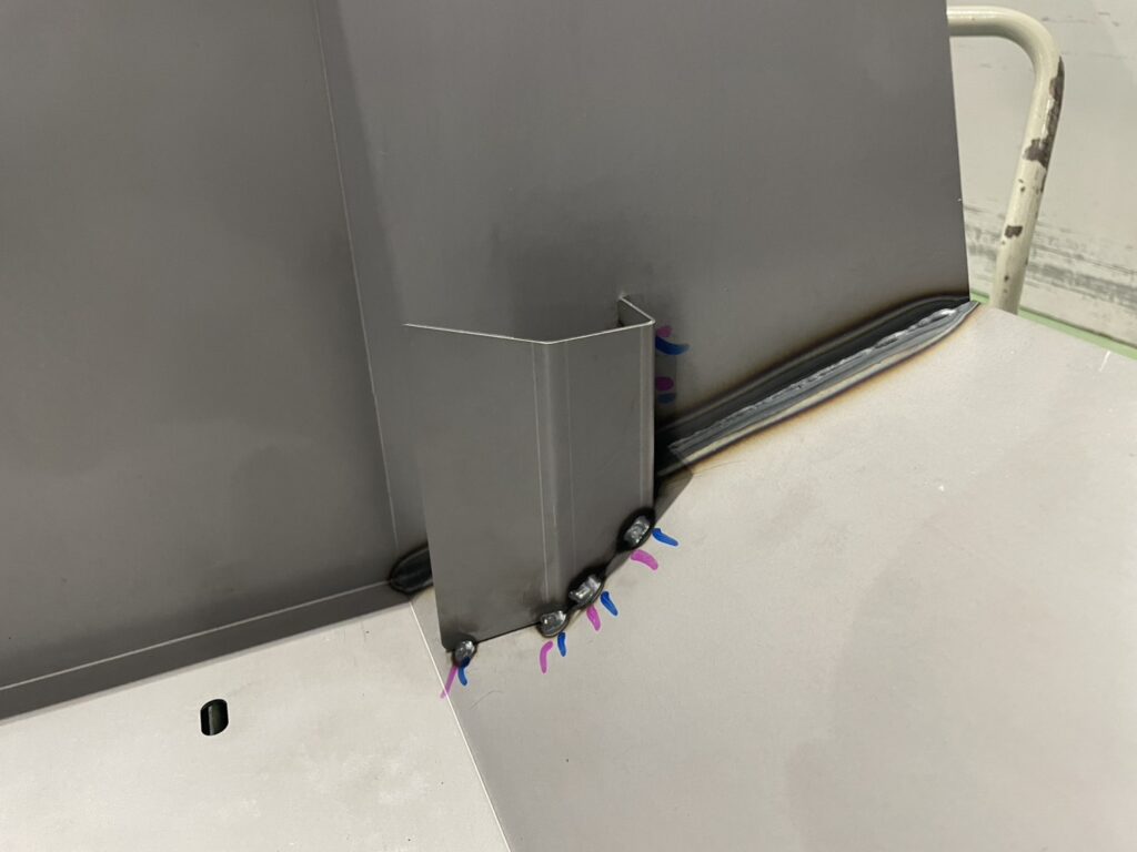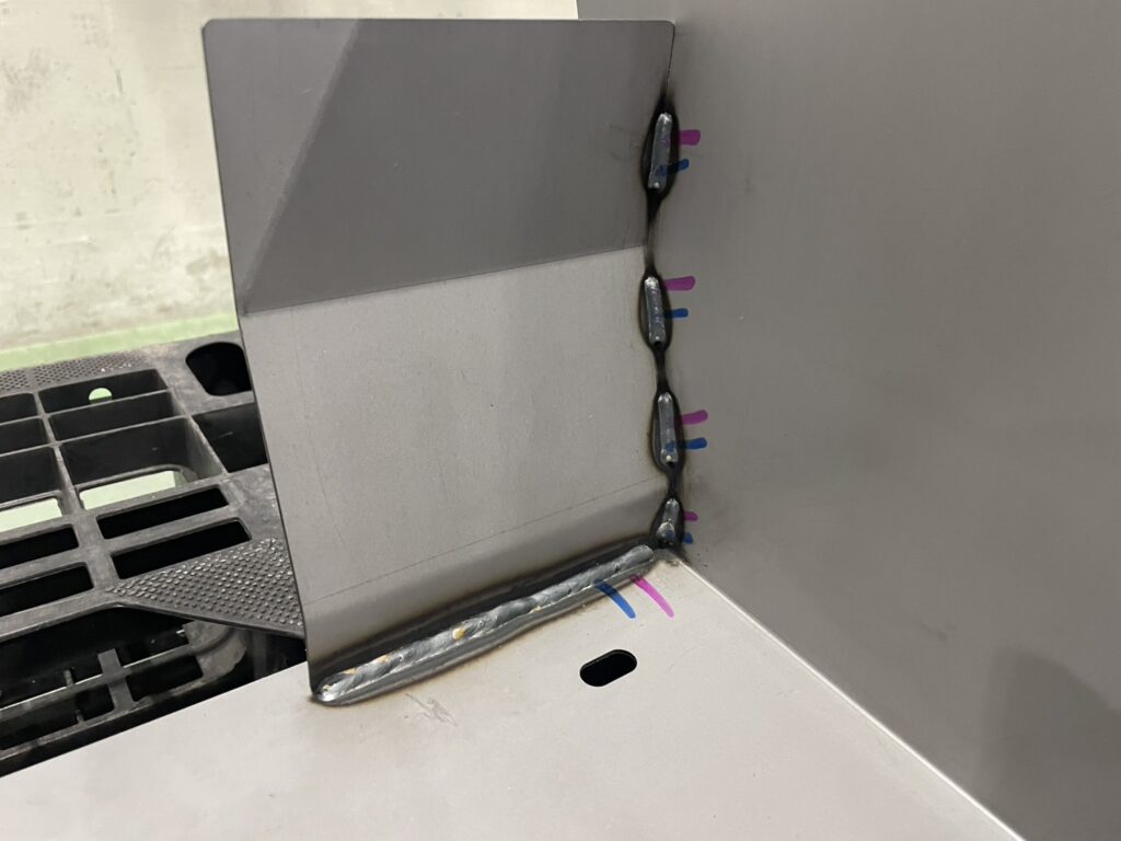 本製品の製造には、専用の溶接治具を使用し、熟練した溶接認定作業者が加工しています。多点数に及ぶ溶接工程を正確にこなすことで、複雑な形状の板金部品を強固に一体化させます。また、溶接箇所が非常に多いため、どうしても熱による歪みが発生しやすい形状です。しかし、当社では溶接完了後に作業者自ら歪修正をおこなったうえで図面公差を厳守し、次工程での組み付けやすさを保証した状態で納品いたします。