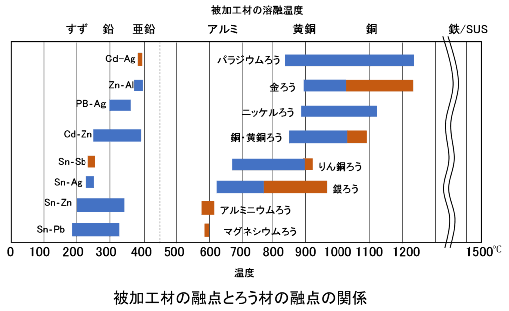 ろう付けによる接合は、母材を加熱し隙間にろう材を流し込むことで接合する加工方法です。このため、母材の加熱温度とろう材の溶融温度の関係を理解しておく必要があります。下図に示すのは被加工材の溶融温度とろう材、はんだの溶融温度を示したものになります。