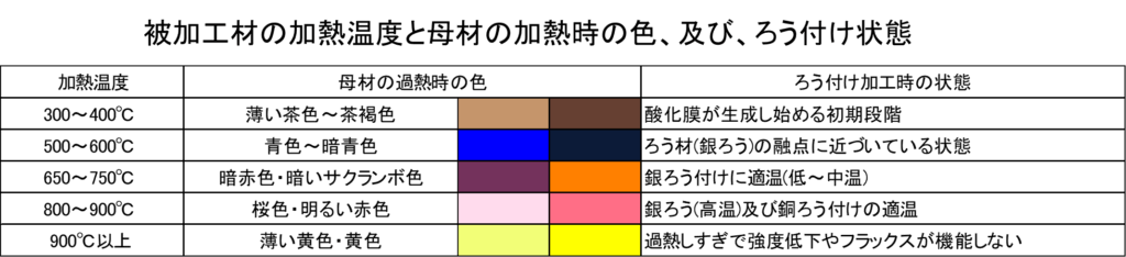 下表は、母材の加熱温度・過熱時の母材の色・その時のろう付け加工の状態を示したものになります。ろう材はよく使われる銅・銀ろうになります。銀ろう付けを行う場合には母材温度が650~750℃になるよう、ろう付けを行う部分を全体を加熱します。銅ろうの場合には更に加熱温度が高く母材は800~900℃に加熱します。これ以上に加熱するとオーバーヒート状態となり強度やフラックスの機能が損なわれる状態となります。