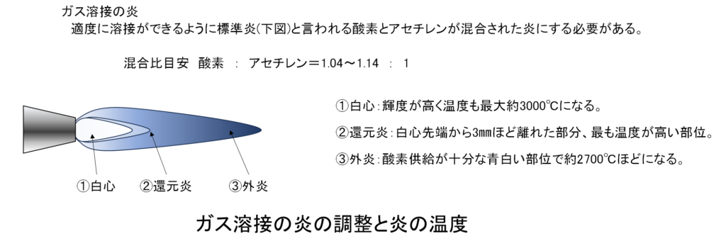 溶接トーチを用いたろう付けは、最も安価に設備を準備できるメリットと作業者のスキルに依存するところが大きいというデメリットがあり、特に加熱手順とフラックスの差すタイミング、ろう材の差すタイミングと差し量が重要となってきます。このスキルアップは作業教育と訓練の実施が重要となります。この中でトーチの火炎の設定状態は加熱時間や方法に大きな影響を与えますので少し説明をします。溶接トーチの火炎の着火は、最初にアセチレンガスを出して溶接用ライターで着火します。その後に酸素を供給し下図のような状態にします。目安は下図中の①白心の長さが約10㎜程度となる様にします。酸素とアセチレンガスの比率は1.04~1.14:1が良い配合になります。母材を加熱する際には白心の先端部にある②還元炎から③外炎を使い、ろう付けを行う部位が上表の650~700℃で均一になる様に加熱します。同じ場所を集中的に加熱すると母材が溶け始め表面が「ただれたような状態」になるため炎の当て方を調整しながら加熱を行います。