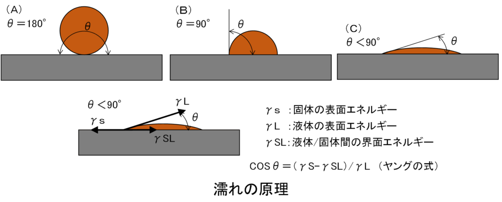 下図は、母材に液体を滴下した時のぬれた状態を示しています。(A)は全く濡れがない状態になり母材と液体が接する角度θは180°になります。(B)は半分程度のぬれた状態で母材と液体の接する角度θは90°になります。(C)は母材と液体の接する角度θが90°以下の状態で最もぬれた状態になります。それぞれの状態で母材と液体はつり合った状態となっています。この状態で固体(母材)の表面エネルギー(γs)(表面張力とも言う)、液体の表面エネルギー(γL)、液体と固体の間の界面エネルギー(γSL)がつり合った状態で静止され、数式で表現したのが下図中の「ヤングの式」と呼ばれます。