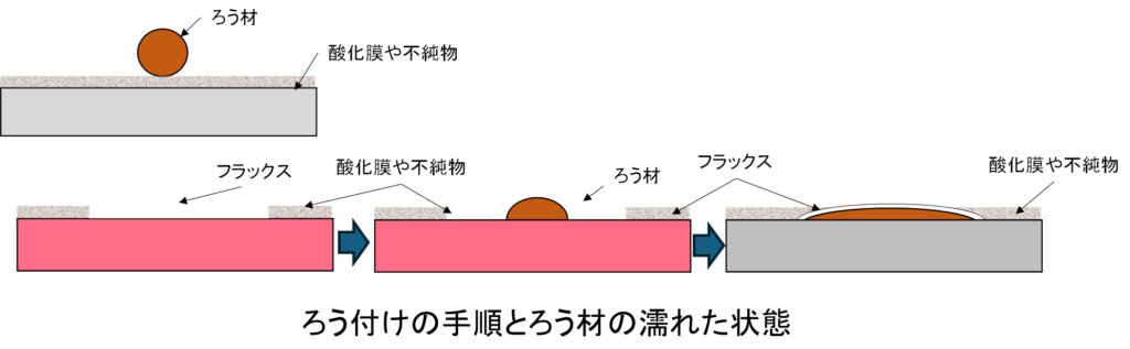 ろう付けの手順を下図に示します。ろう付けを行う場合には酸化被膜や母材表面の汚れを除去する必要があります。母材表面の清浄化が行われないと下図上の様にろう材が「はじき」濡れが起きません。母材を加熱し適温(650~700℃)になったところでフラックスを塗るとフラックスが溶け母材表面の酸化被膜や汚れが除去されます。フラックスが溶けると母材表面には透明な保護膜が形成されるため、ろう付けをする部分に均一にフラックスがついた状態で、ろう材を入れます。ろう材は、トーチの火炎を直接あてて母材に滴下させるように入れ、母材上でろう材が濡れる状態を観ながらろう付け部に広げていきます。必要なところまでろう材が広がると加熱を終了します。その後、母材とろう材が冷え固まりますが、この時にろう材の表面にはフラックスがガラス状となり覆われ、酸化が防止されます。