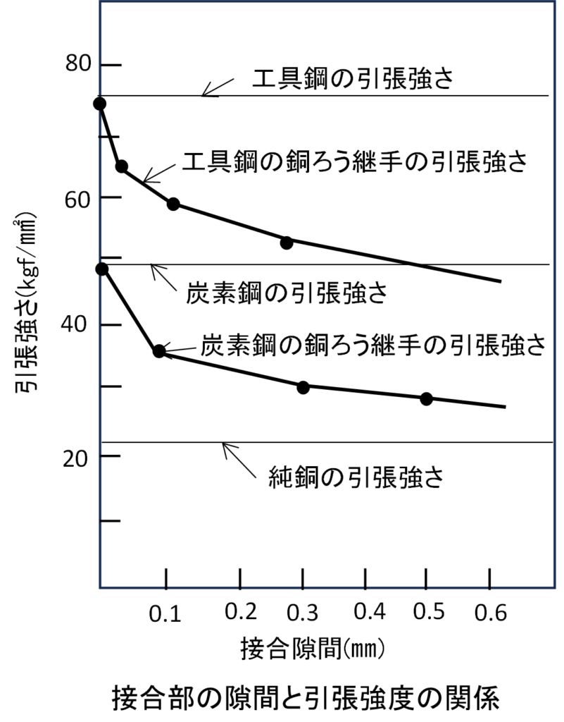 2部品の接合をろう付けで行う場合には、部品間に隙間を設けておく必要があります。母材を加熱し、ろう付けを行うと毛細管現象により隙間に浸透し、接合ができます。この隙間の設定と接合強度の関係を下図に示します。部品間の隙間を横軸に、引張強さを縦軸にして、工具鋼、炭素鋼を銅ろうを用いて接合したときの強度を測定した結果になります。隙間がない状態に近づくと、母材の強度と同等の引張強さを示しますが、接合部の隙間が広くなるに従って、強度が低くなっていきます。特に工具鋼では隙間が0.05㎜程度になると急激に引張強さが低くなり、炭素鋼でも0.1㎜の隙間になると急激に引張強さが低くなっています。ろう付けではある程度の隙間がある方がろう材がスムーズに入りますが、広すぎると強度が低くなるため、製品の要求品質に合わせたクリアランスの設定が必要となります。
